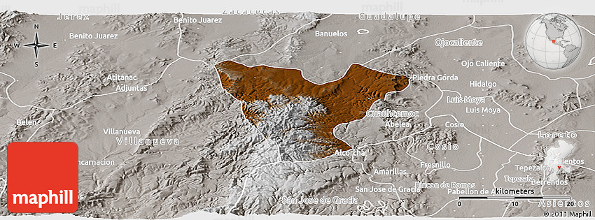 The panoramic physical map represents one of several map types and styles available. Look at Genaro Codina, Zacatecas, Mexico from different perspectives.