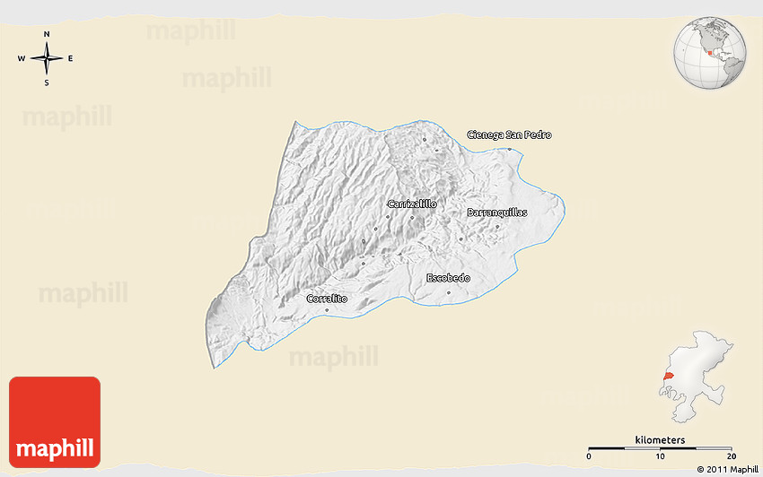 This map uses colors of vintage antique maps. Jimenez del Teul is highlighted with white. The rest of the map is beige colored shaded relief map.