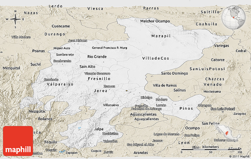 This map uses colors of vintage antique maps. Zacatecas is highlighted with white. The rest of the map is beige colored shaded relief map.