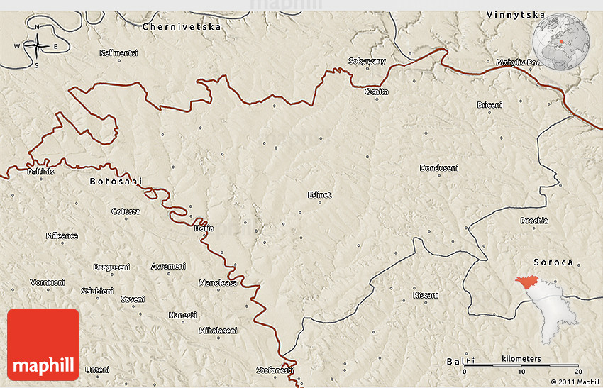 Shaded relief map shows landscape features, such as mountains, valleys and plateaus. Flat areas are smooth on the map, areas with steep slopes and mountains appear more rough. The above map of Edinet was created using a digital elevation model.