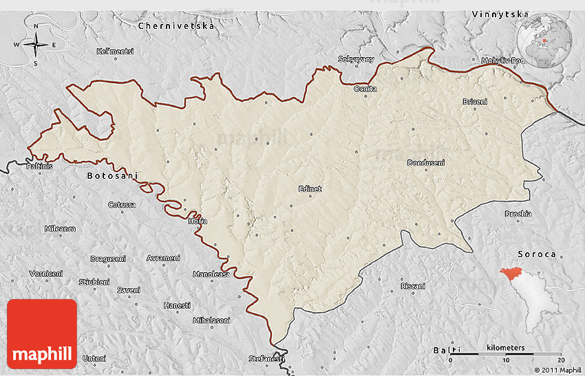 Shaded relief map shows landscape features, such as mountains, valleys and plateaus. Flat areas are smooth on the map, areas with steep slopes and mountains appear more rough. The above map of Edinet was created using a digital elevation model.