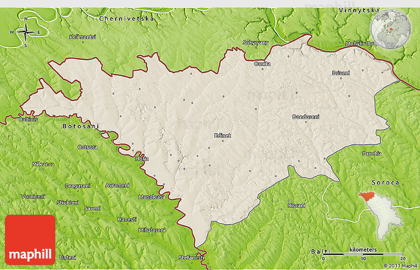 Physical map illustrates the mountains, lowlands, oceans, lakes and rivers and other physical landscape features of Edinet. Differences in land elevations relative to the sea level are represented by color.