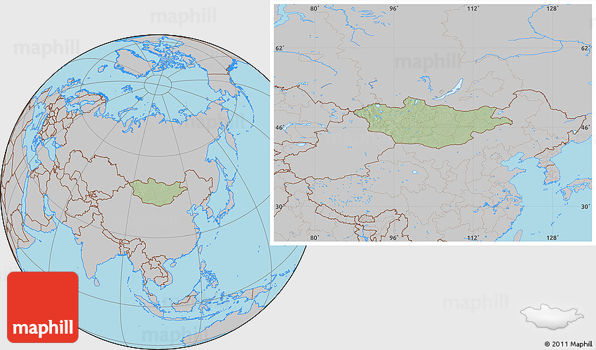 Maphill is a collection of map images. This image combines a savanna style map with the globe centered on Mongolia. Use the buttons under the image to switch to different map types.