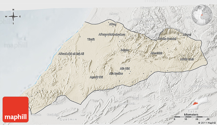Shaded relief map shows landscape features, such as mountains, valleys and plateaus. Flat areas are smooth on the map, areas with steep slopes and mountains appear more rough. The above map of Tiznit was created using a digital elevation model.