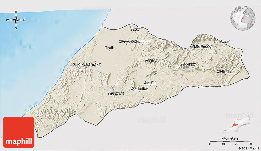 Shaded relief map shows landscape features, such as mountains, valleys and plateaus. Flat areas are smooth on the map, areas with steep slopes and mountains appear more rough. The above map of Tiznit was created using a digital elevation model.