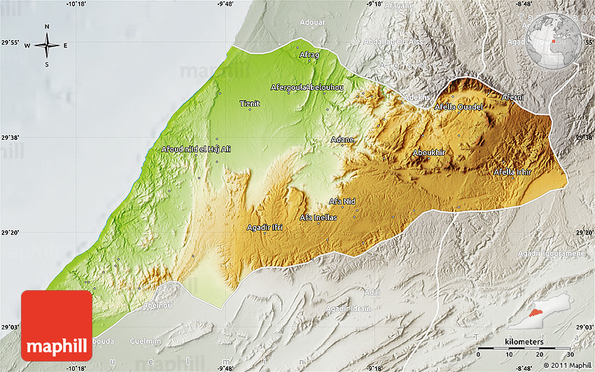 Physical map illustrates the mountains, lowlands, oceans, lakes and rivers and other physical landscape features of Tiznit. Differences in land elevations relative to the sea level are represented by color.