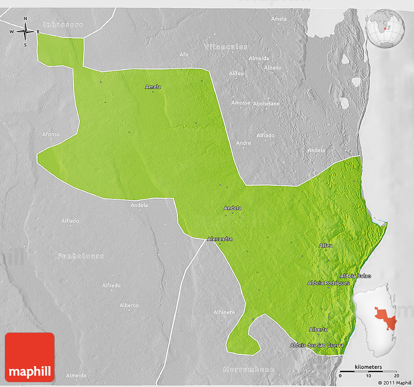 Physical map illustrates the mountains, lowlands, oceans, lakes and rivers and other physical landscape features of Massinga. Differences in land elevations relative to the sea level are represented by color.