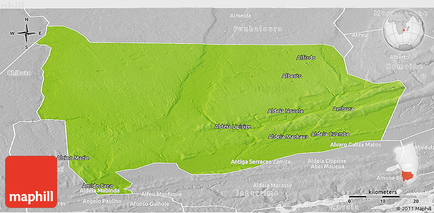 The panoramic physical map represents one of several map types and styles available. Look at Panda, Inhambane, Mozambique from different perspectives.