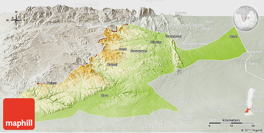 The panoramic physical map represents one of several map types and styles available. Look at Mossurize, Manica, Mozambique from different perspectives.