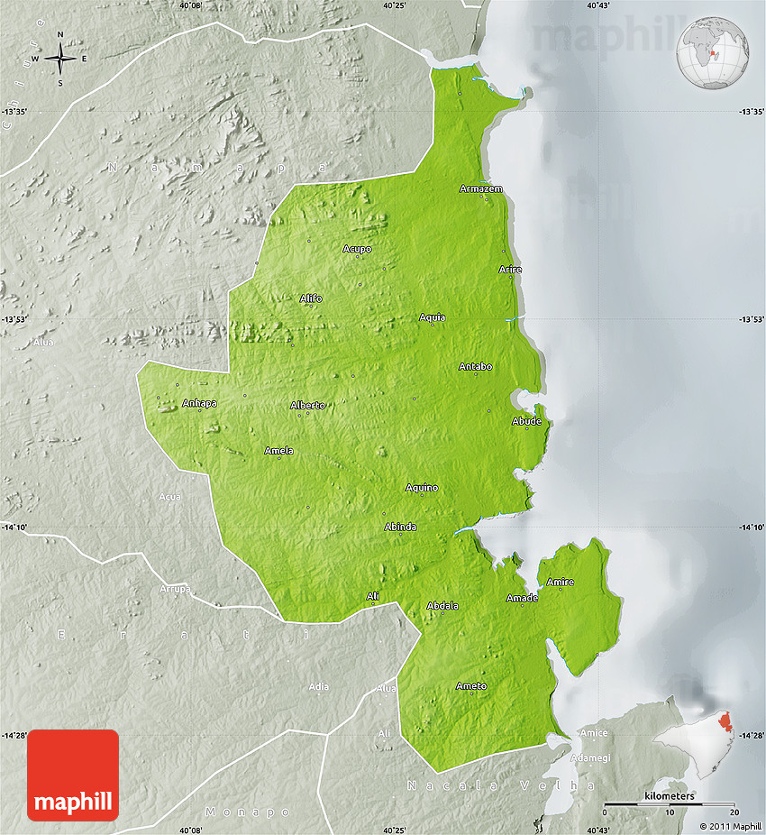 Physical map illustrates the mountains, lowlands, oceans, lakes and rivers and other physical landscape features of Memba. Differences in land elevations relative to the sea level are represented by color.