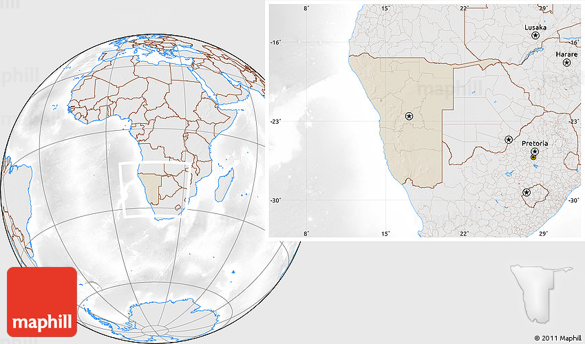 Maphill is a collection of map images. This image combines a shaded relief map with the globe centered on Namibia. Use the buttons under the image to switch to different map types.