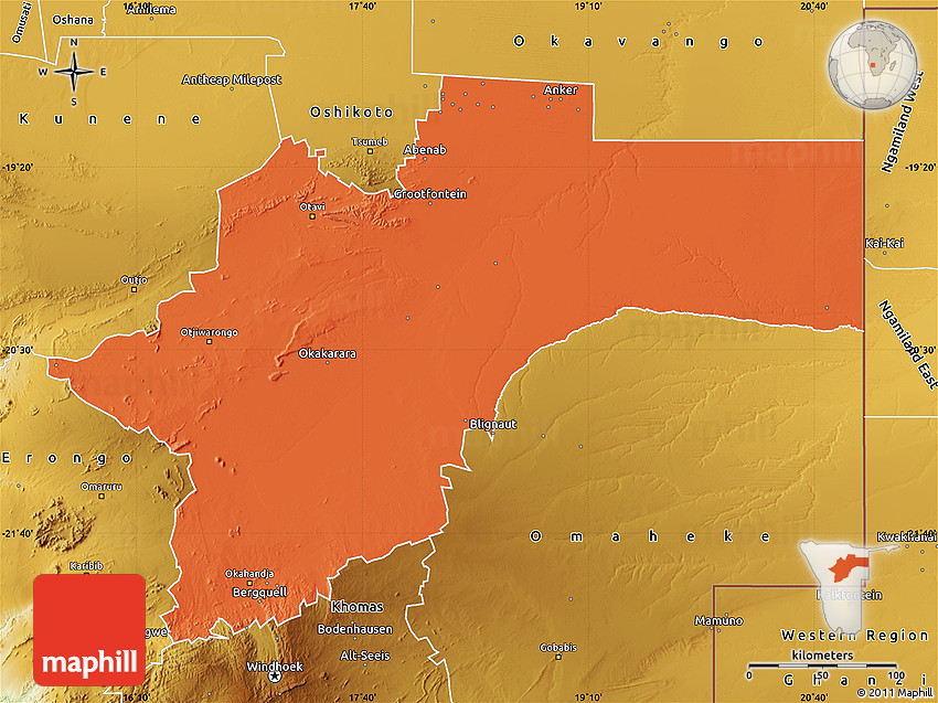 Physical map illustrates the mountains, lowlands, oceans, lakes and rivers and other physical landscape features of Otjozondjupa. Differences in land elevations relative to the sea level are represented by color.