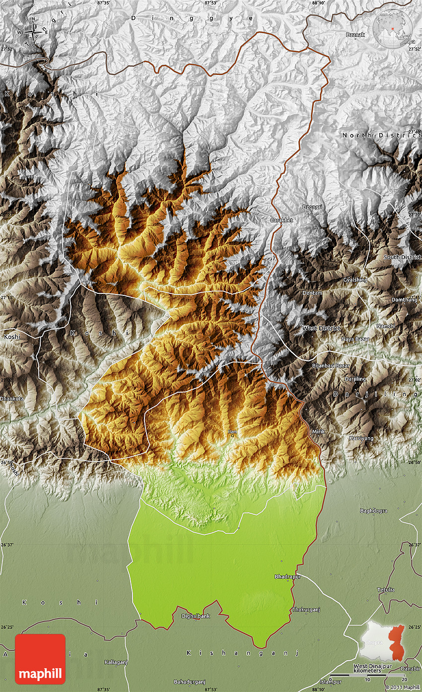 Physical map illustrates the mountains, lowlands, oceans, lakes and rivers and other physical landscape features of Mechi. Differences in land elevations relative to the sea level are represented by color.