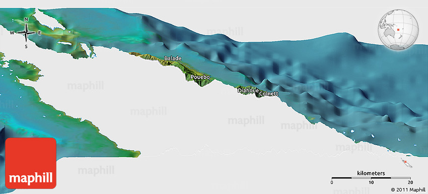 Maphill is a collection of map images. This perspective view of Pouébo at an angle of 30° is one of these images. Use the Detailed button under the image to switch to a detailed map.