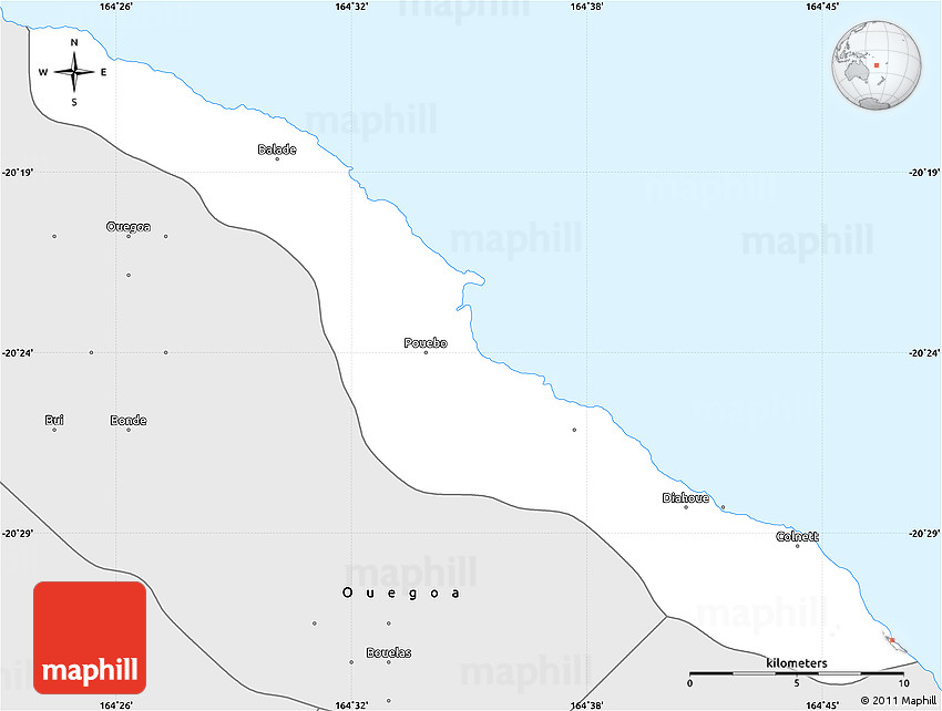 The simple silver style outline map represents one of several map types and styles available. Look at Pouébo, Nord, New Caledonia from different perspectives.