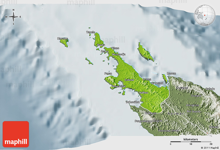 Physical map illustrates the mountains, lowlands, oceans, lakes and rivers and other physical landscape features of Poum. Differences in land elevations relative to the sea level are represented by color.