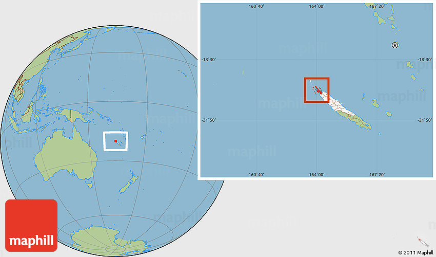 The location map of Poum combines two projections: the orthographic azimuthal projection for the globe and the simple geographic projection for the rectangular part of the map. Geographic projection has straight meridians and parallels, each degree of latitude and longitude is the same size over the entire world map.