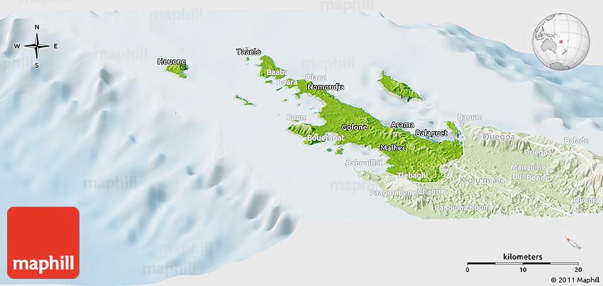 Physical map illustrates the mountains, lowlands, oceans, lakes and rivers and other physical landscape features of Poum. Differences in land elevations relative to the sea level are represented by color.