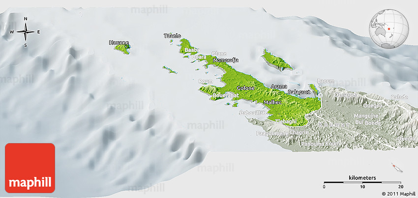 Physical map illustrates the mountains, lowlands, oceans, lakes and rivers and other physical landscape features of Poum. Differences in land elevations relative to the sea level are represented by color.