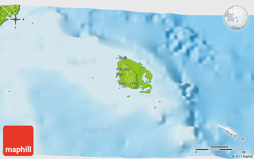 Physical map illustrates the mountains, lowlands, oceans, lakes and rivers and other physical landscape features of l'Île des Pins. Differences in land elevations relative to the sea level are represented by color.