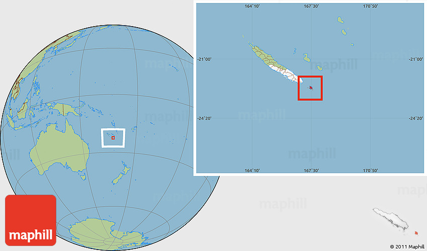The location map of l'Île des Pins combines two projections: the orthographic azimuthal projection for the globe and the simple geographic projection for the rectangular part of the map. Geographic projection has straight meridians and parallels, each degree of latitude and longitude is the same size over the entire world map.