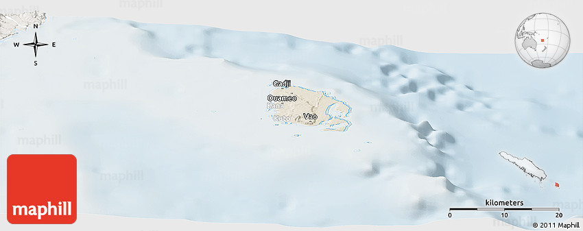 The panoramic shaded relief map represents one of several map types and styles available. Look at l'Île des Pins, Sud, New Caledonia from different perspectives.