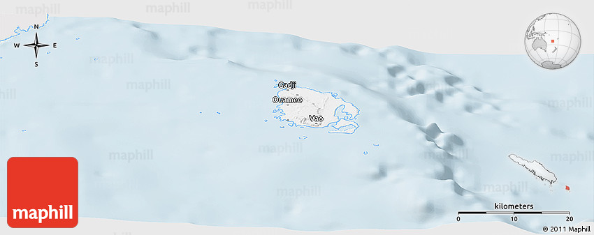 The panoramic silver style map represents one of several map types and styles available. Look at l'Île des Pins, Sud, New Caledonia from different perspectives.