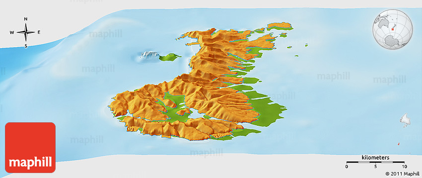Physical map illustrates the mountains, lowlands, oceans, lakes and rivers and other physical landscape features of Auckland islands. Differences in land elevations relative to the sea level are represented by color.