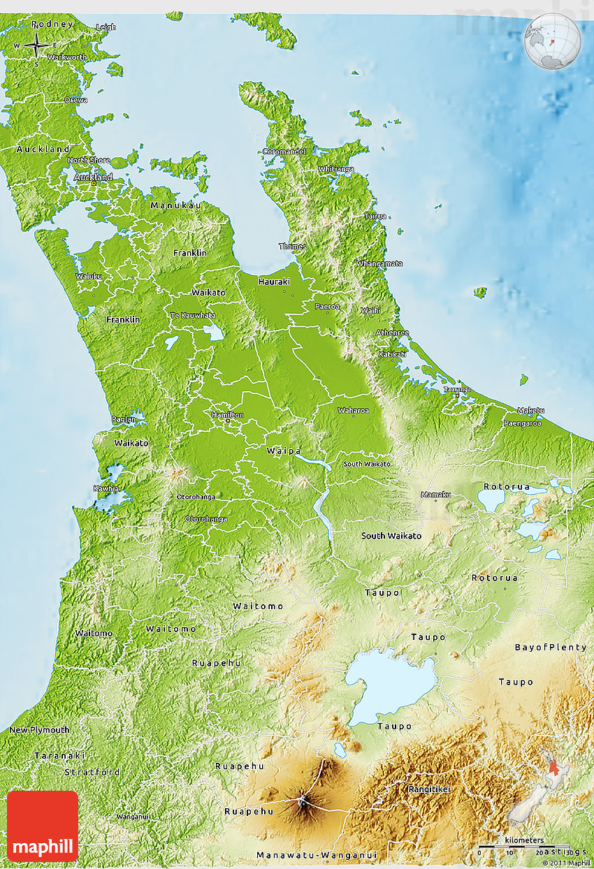 Physical map illustrates the mountains, lowlands, oceans, lakes and rivers and other physical landscape features of Waikato. Differences in land elevations relative to the sea level are represented by color.