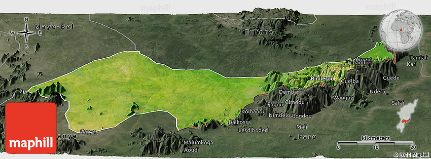 The panoramic satellite map represents one of several map types and styles available. Look at Jada, Adamwara, Nigeria from different perspectives.