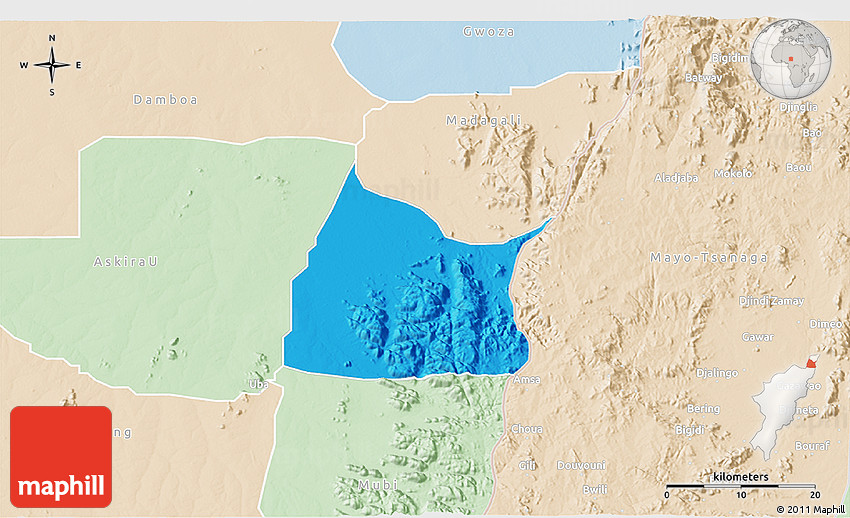 The 3D political map represents one of several map types and styles available. Look at Michika, Adamwara, Nigeria from different perspectives.