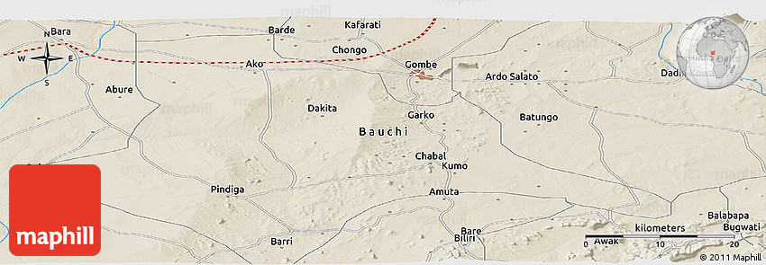 The panoramic shaded relief map represents one of many map types and styles available. Look at Danaje, Yamaltu/, Bauchi, Nigeria from different perspectives.