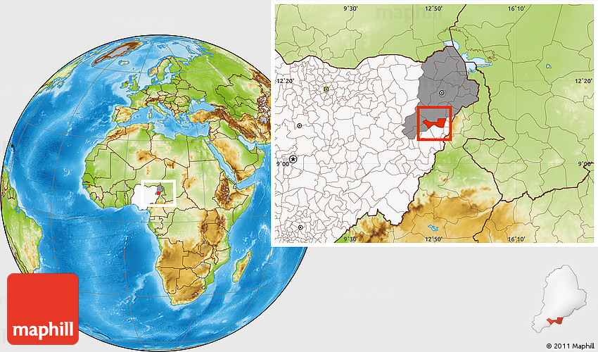 Maphill is a collection of map images. This image combines a physical map with the globe centered on Askira/U. Use the buttons under the image to switch to different map types.