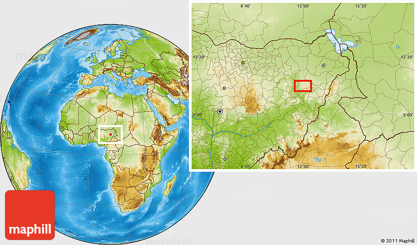 Maphill is a collection of map images. This image combines a physical map with the globe centered on Hashidu Fulani. Use the buttons under the image to switch to different map types.