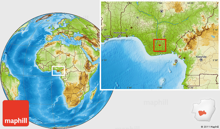 Maphill is a collection of map images. This image combines a physical map with the globe centered on Owerri. Use the buttons under the image to switch to different map types.