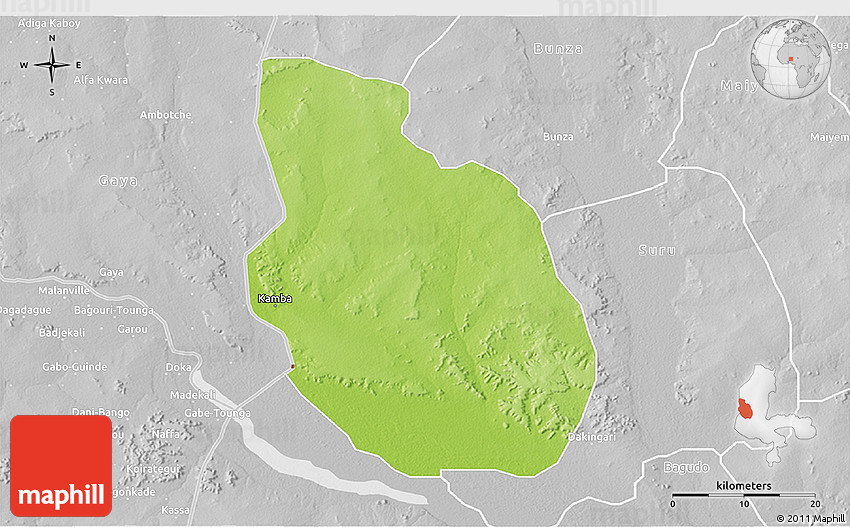 The 3D physical map represents one of several map types and styles available. Look at Dandi, Kebbi, Nigeria from different perspectives.