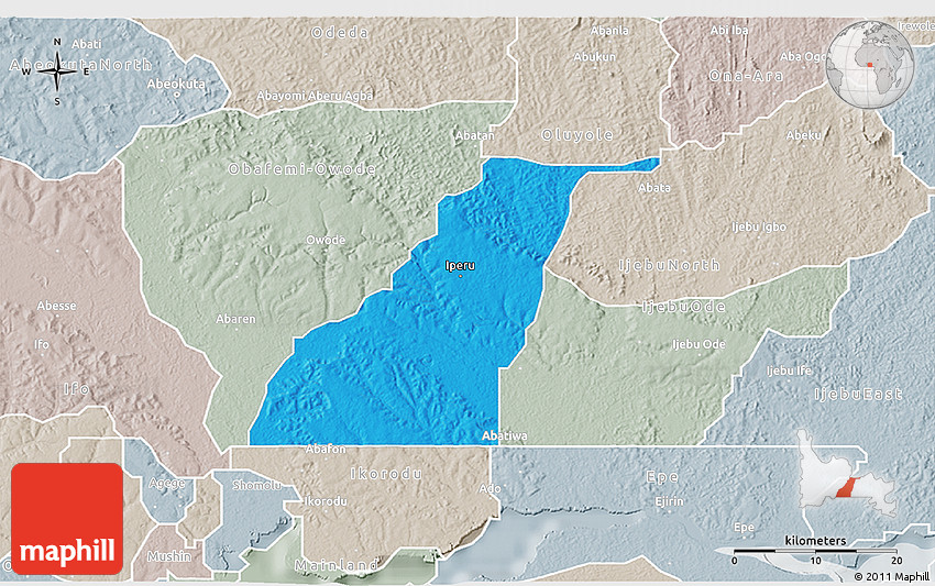 The 3D political map represents one of several map types and styles available. Look at Shagamu, Ogun, Nigeria from different perspectives.