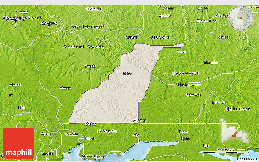 The 3D shaded relief map represents one of several map types and styles available. Look at Shagamu, Ogun, Nigeria from different perspectives.