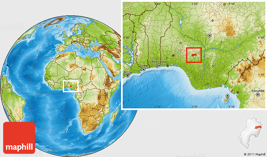 Maphill is a collection of map images. This image combines a physical map with the globe centered on AkokoSou. Use the buttons under the image to switch to different map types.