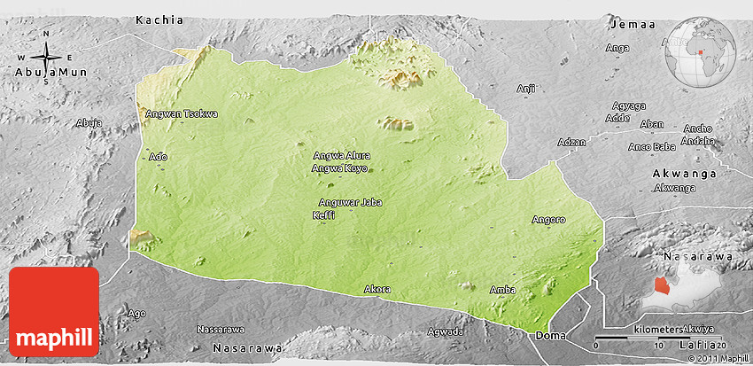 The panoramic physical map represents one of several map types and styles available. Look at Keffi, Plateau, Nigeria from different perspectives.