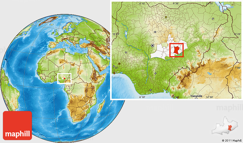 Maphill is a collection of map images. This image combines a physical map with the globe centered on Shendam. Use the buttons under the image to switch to different map types.
