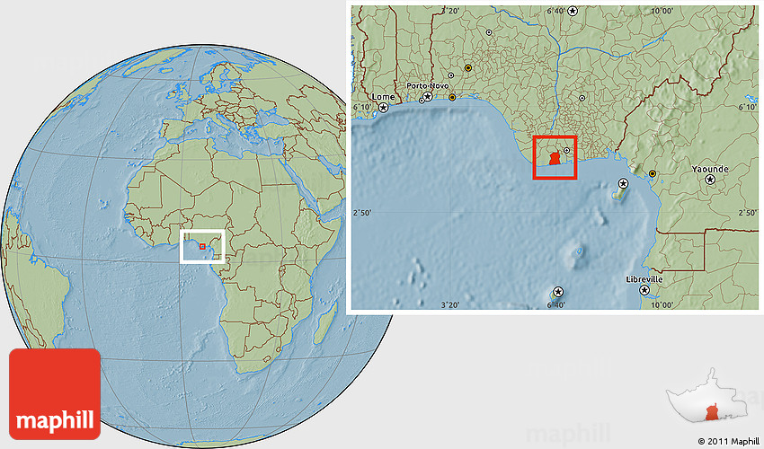 Maphill is a collection of map images. This image combines a savanna style map with the globe centered on Akukutor. Use the buttons under the image to switch to different map types.