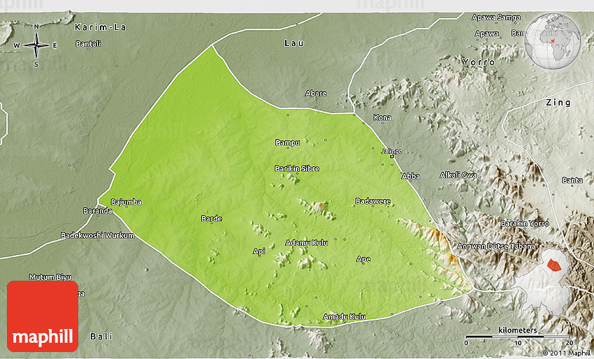 The 3D physical map represents one of several map types and styles available. Look at Jalingo, Taraba, Nigeria from different perspectives.