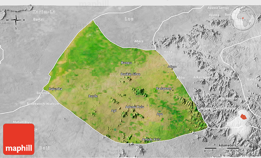 Each map type offers different information and each map style is designed for a different purpose. Read about the styles and map projection used in the above map (Satellite 3D Map of Jalingo, lighten, desaturated).