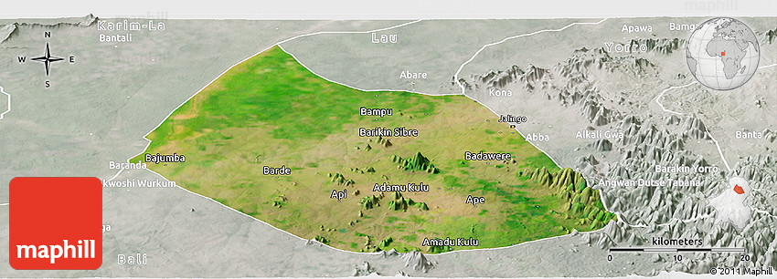 The panoramic satellite map represents one of several map types and styles available. Look at Jalingo, Taraba, Nigeria from different perspectives.