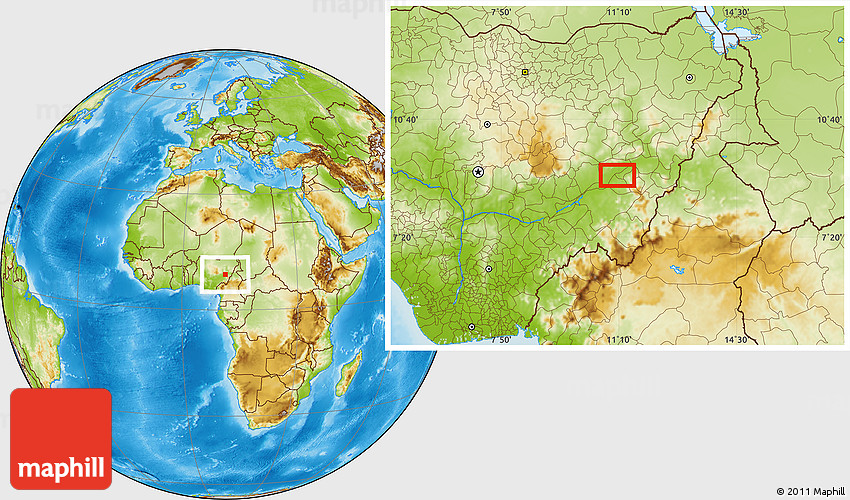 Maphill is a collection of map images. This image combines a physical map with the globe centered on Garin Dogo. Use the buttons under the image to switch to different map types.