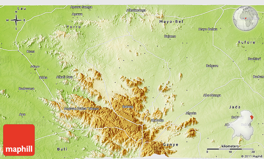 The 3D physical map represents one of several map types and styles available. Look at Zing, Taraba, Nigeria from different perspectives.