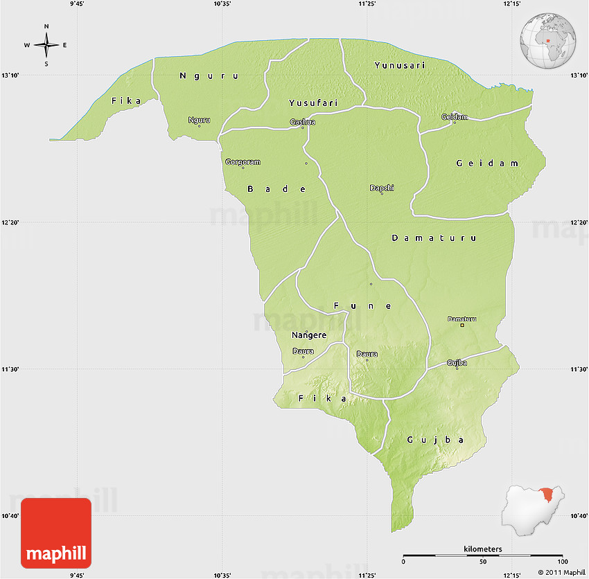 Physical map illustrates the mountains, lowlands, oceans, lakes and rivers and other physical landscape features of Yobe. Differences in land elevations relative to the sea level are represented by color.