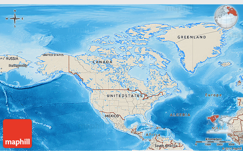 The value of Maphill lies in the possibility to look at the same area from several perspectives. Maphill presents the map of North America in a wide variety of map types and styles.