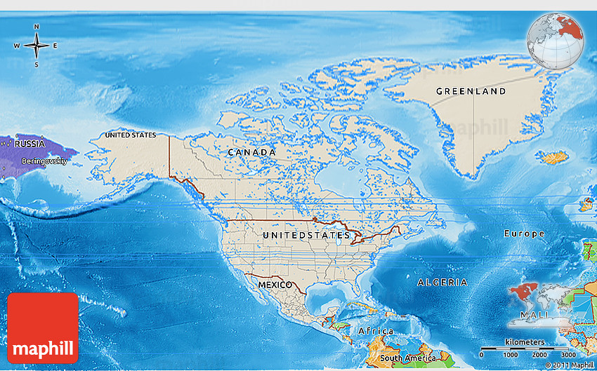 The value of Maphill lies in the possibility to look at the same area from several perspectives. Maphill presents the map of North America in a wide variety of map types and styles.